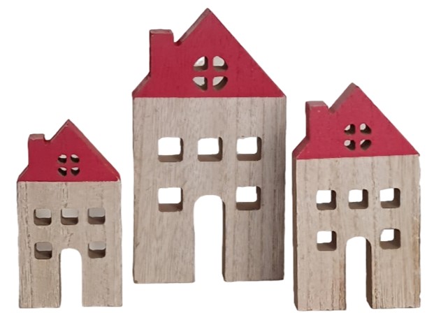 3 Holzhäuser mit roten Dächern. Die Rückseite der Häuser ist ohne die rote Farbe.