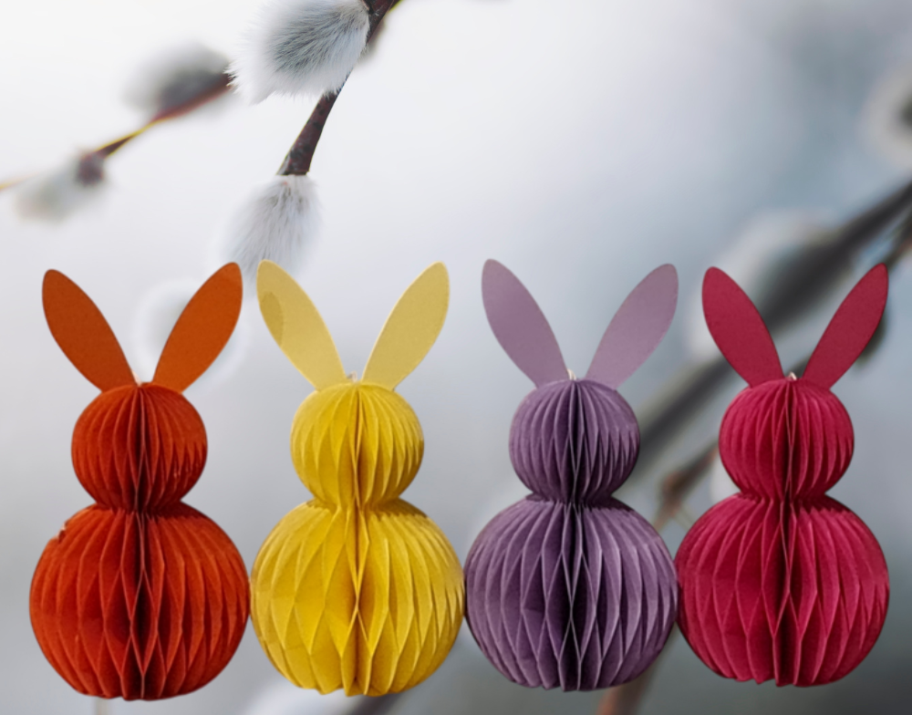 Bringen Sie frischen Frühjahrszauber in Ihr Zuhause mit unseren dekorativen 3D-Papierhasen! Diese charmanten Osterhasen sind in den Farben Orange, Gelb, Flieder und Pink erhältlich und setzen fröhliche Farbakzente in Ihrer Osterdekoration.