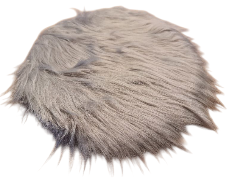 Ein stilvolles, rundes, künstliches Dekofell in elegantem Grau mit einem Durchmesser von ca. 30 cm.