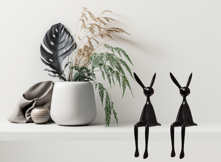 Mit seiner sitzenden Form wirkt der Hase lebendig und zugleich angenehm zurückhaltend. Als Kantenhocker lässt er sich perfekt auf Regalen, Sideboards, Fensterbänken oder Kommoden platzieren und sorgt dort für einen modernen Blickfang.