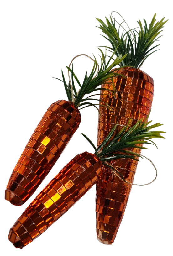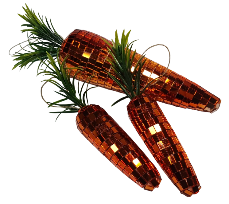 Das 3er-Set besteht aus zwei kleineren und einer größeren Karotte, die vollständig mit kleinen Spiegelsteinchen beklebt sind und dadurch einen faszinierenden Disco- und Spiegeleffekt erzeugen.